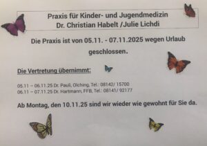 unsere Kinderarztpraxis in Gröbenzell ist vom 5.-7.11. 2025 geschlossen.