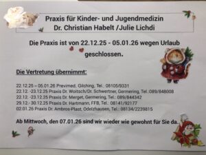 unsere Kinderarztpraxis in Gröbenzell ist vom 22.12.25 bis 5.1.26 geschlossen.